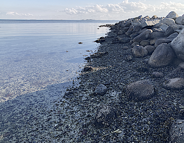 Vår resa fortsatte vidare från de översvämmade markerna utanför staden Ribe, som grundades omkring år 705 – 710 e.Kr och är både Danmarks äldsta stad och faktiskt en av Nordens äldsta städer. Här finns en historia som sträcker sig över 1300 år tillbaka i tiden. Vår väg tog oss till Sönderborg, som ligger vid Flensburgfjorden på ostkusten av Danmark. Staden Sönderborg växte fram runt slottet som låg på plasen under 1100-talet. På stranden nedanför husen och slottet i Sönderborg fanns det stora mängder ålgräs på delar av stranden, men även blåstång och blåmusslor på andra delar. Som ofta är fallet ligger det stenpirar som avdelar stranden och antagligen påverkar vad som växer och såklart driver iland. På den del av den långa stranden där blåstång; Fucus vesiculosus och blåmusslor, Mytilus edulis, dominerade på botten vid lågvatten var botten mer stenig.