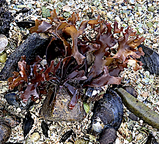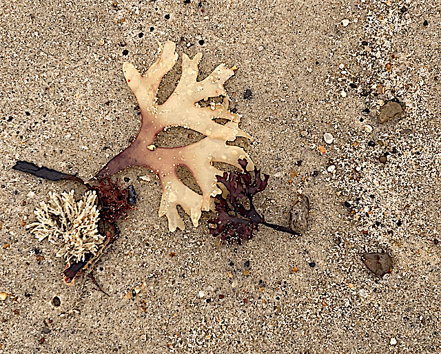 Andra fynd var en gren av ektång, Halidrys siliculosus, lite blåstång och sågtång och en massa av kräkel, Furcellaria lumbricalis som skiftade i allt från rött, svart till blekta delar i grönt och vitt. Inne ibland tången låg det också havsris, Anhfletia plicata, ribbeblad, Delesseria sanguinea och lite tarmalg, Ulva intestinalis. Den artrika rödalgsfloran tyder på att det måste finnas gott om lite djupare hårda bottnar i närheten utanför stranden.