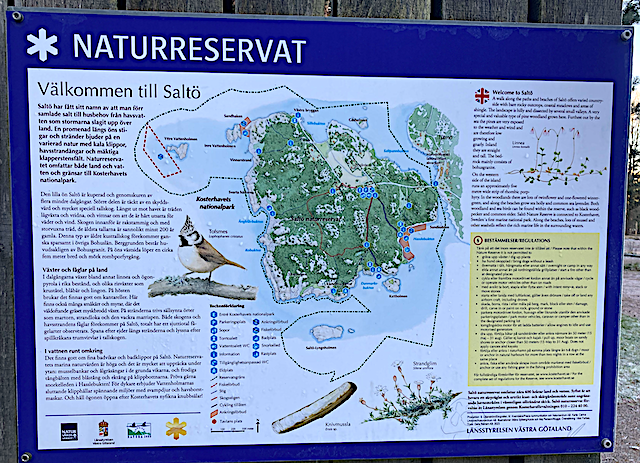 Vid entrén sitter en skylt med information om naturreservatet.Vyn över Danmarksbukten från bänken. Blåstångsplanta på en sten. Hittar du sjöstjärnan?Frusen sjöstjärna, havstulpaner och små groddplantor av blåstång..