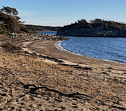 Svallhagen en favorit strand för bad och strandfyndDen röda bojen gömmer sig i sjörök,