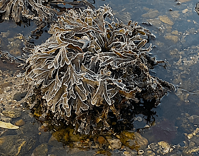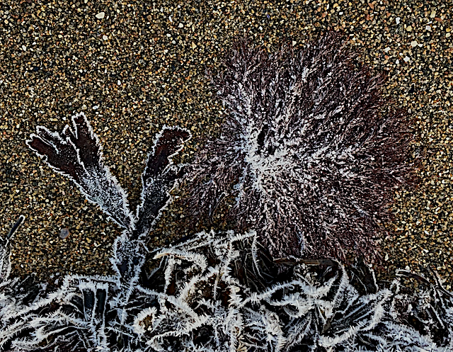 Strax under den spegelblanka ytan låg många fintrådiga rödalger lösa på botten. Där klarar de att leva även om vattnet är kallt. Det de inte tål är att hamna uppe på land och täckas av frostkristaller. Då sprängs cellerna. Men tänk så vackra mönster en frostig rödalg bildar tillsammans med tången på stranden.