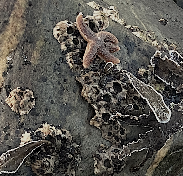 Under natten var det riktigt kallt och på morgonen vid nio-tiden var det maximalt lågvatten. Det är ju inte så stort tidvatten vid svenska kusten, men lite skillnad gör dett allt. Mycket av den grunt växande blåstången var klädd av rimfrost. Det ger vackra, vita konturer och skadar inte tången. Blåstång på västkusten klarar att utsättas för frost under några timmar tills vattnet kommer tillbaka. Det gör däremot inte blåstång som normalt lever under ytan i Östersjön. Så blir det en längre lågvattenperiod och tången ligger torrlagd kommer en att dö. Den har tappat egenskapen av att tåla frost efter att i många generationer leva under ytan. Sjöstjärnor klarar däremot inte av att frysas. Vi fann flera stycken som hade frusit fast inne ibland grenarna på tångplantorna eller uppe på stenarna i strandkanten. Havstulpanerna klarar i alla fall att hålla sig stängda och överlever även om det är minusgrader i luften.