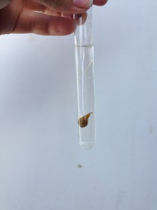 Experimentuppställning i burk. Varje burk innehåller en bit blåstång eller smaltång.