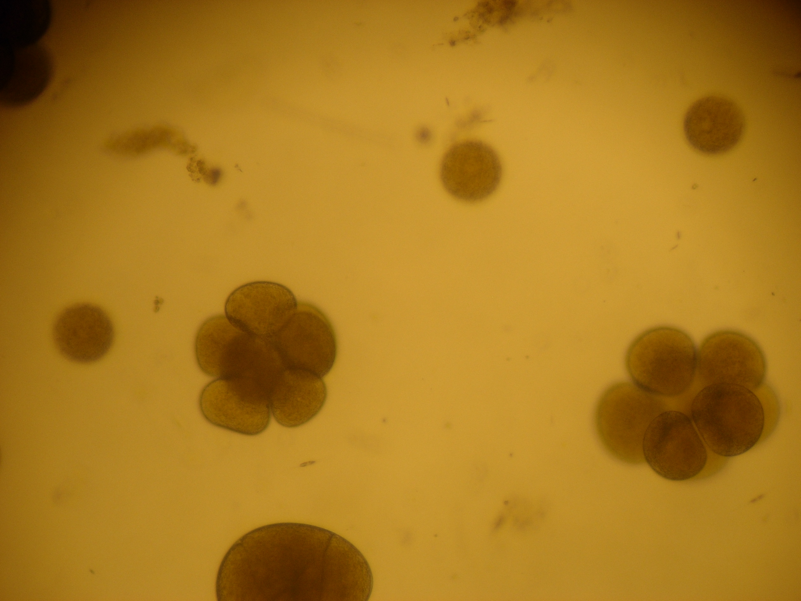 Oogonens vägg av polysackarid löses upp och de åtta äggen väller ut. I nederkant skymtar ett ännu oöppnat oogon. De tre perfekt runda cellerna är redan frigjorda ägg.