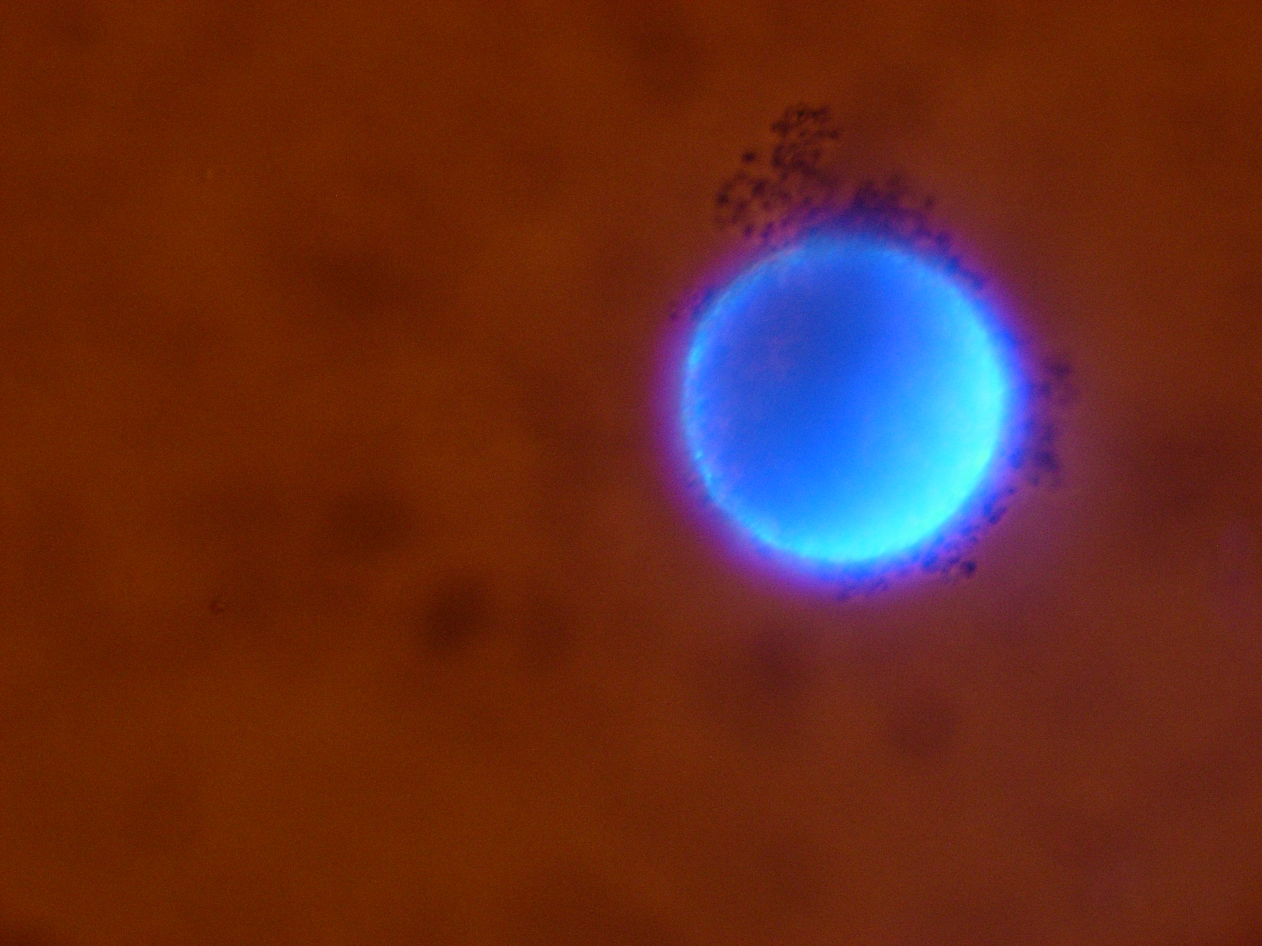 När ett ägg befruktas bildas en cellvägg runt ägget. Väggen hindrar fler spermier, som syns samlade runt ägget, från att tränga in. Väggen lyser vackert blått i UV-ljus efter att ha färgats med Calcofluorwhite
