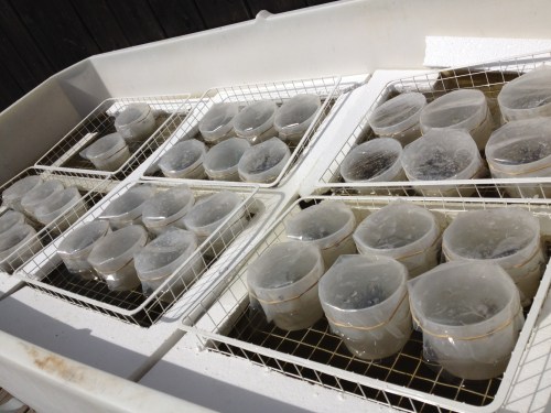 Experimentuppställning i burk. Varje burk innehåller en bit blåstång eller smaltång.