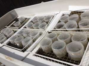 I går torsdag gjordes första avläsningen och vi kunde redan se fina ägg i botten på vissa provrör, både från blåstång och smaltång. Vid varje avläsning flyttar vi receptaklen till nya provrör med saltvatten och samlar in de eventuella ägg som släppts i de gamla provrören.