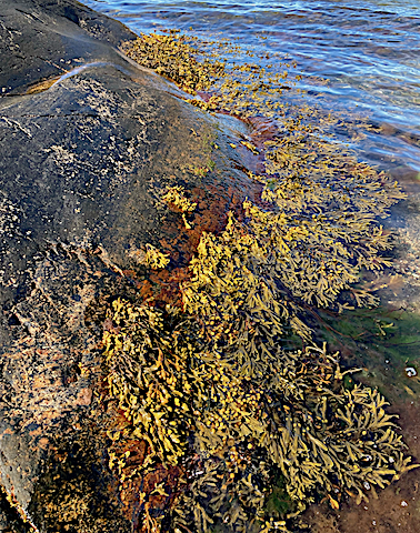 I mitten av juli blev det en tur till Nordkoster. Där fanns det stora bälten med fjolårets blåmusslor i strandlinjen och det går att hitta bra med musslor även längre in i skärgården. Klarar de att överleva till nästa år kommer vi kanske att kunna festa på musslor. Och varför inte tillsammans med slemtråd, Nemalion multifidum som växter lite högre upp på klipporna. Vi plockade hem lite och åt som tilltugg till stillahavsostron, Magallana gigas. Det smakade också utmärkt.