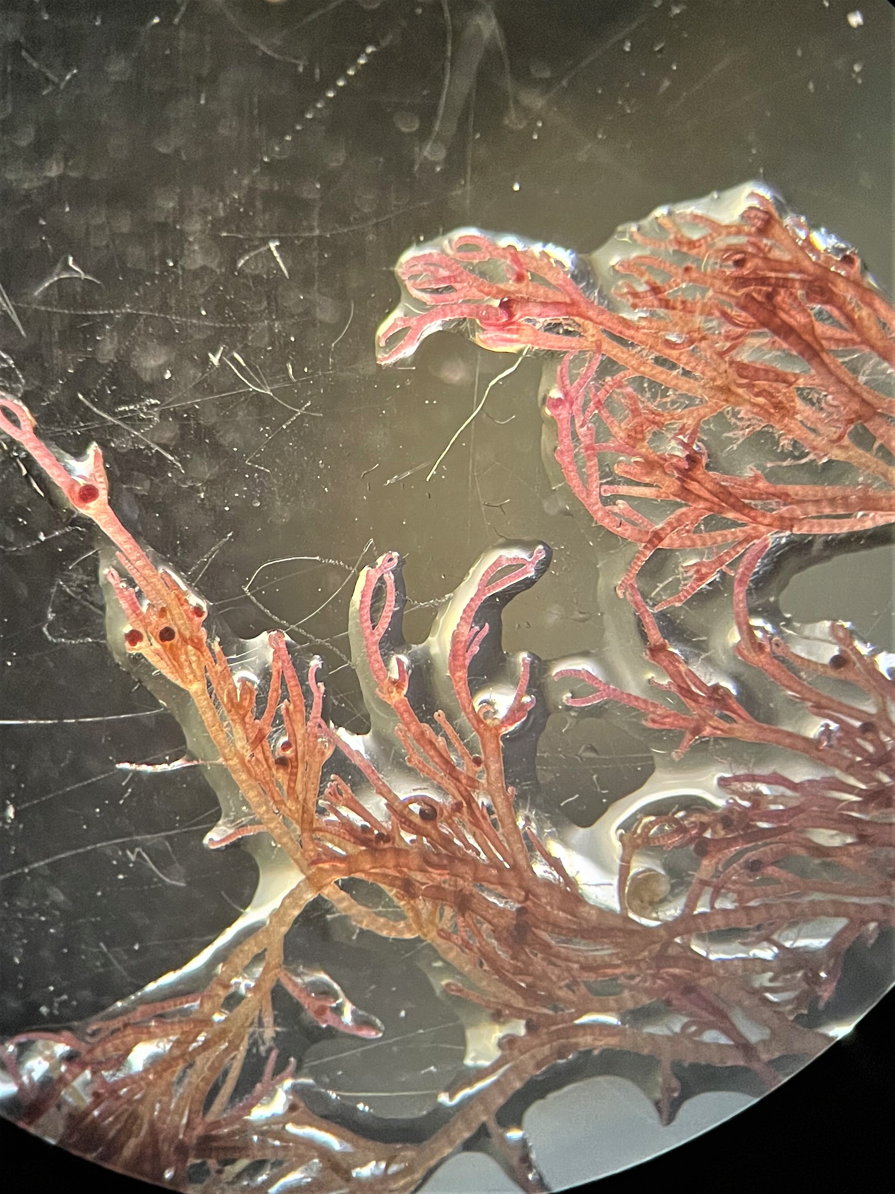 Rödalgen grov rödsläke (Ceramium rubrum) känns lätt igen under lupp med sina randiga grenar och kloformade spetsar. Här syns även runda, mörkröda sporsamlingar i grenvecken.