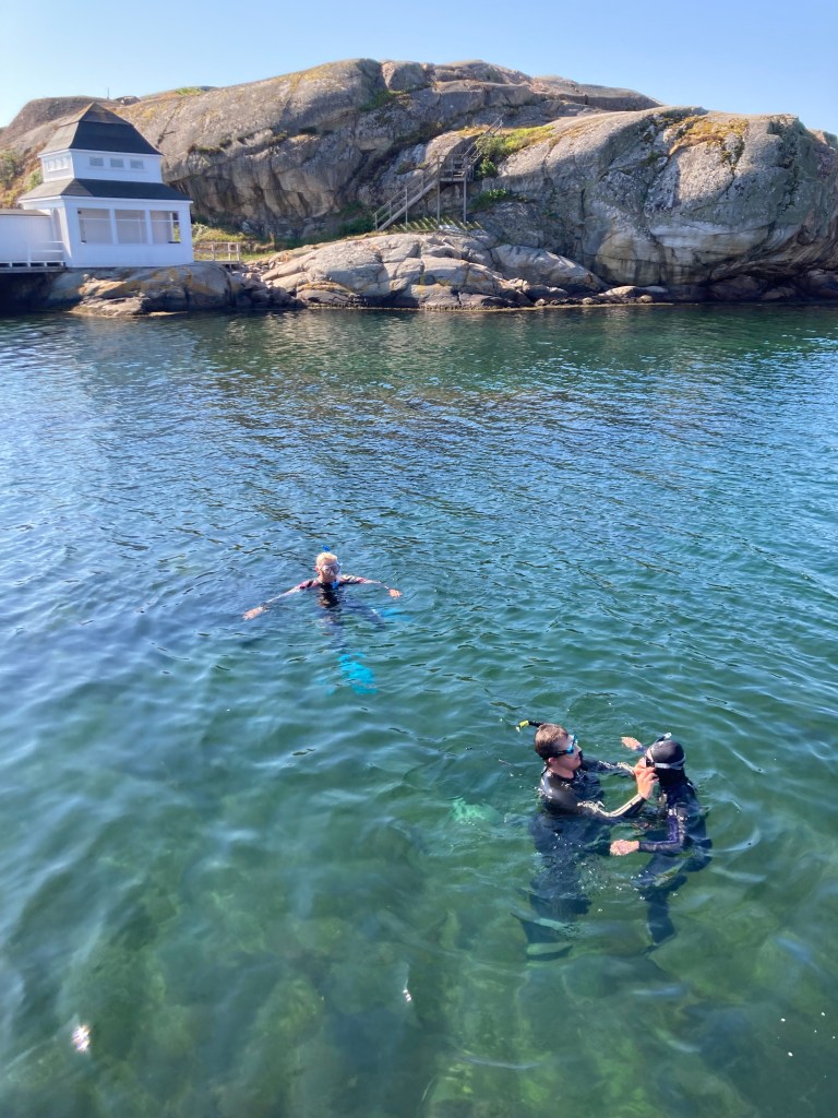 Så var det dags att ta en näve nätpåsar, ta på mask och snorkel samt fenor och påbörja insamlingen av alger. Vi hoppade i och simmade ut mot Släggö. Så vackert det är! Solens strålar dansar ner i vattnet och lyser upp en klargrön havssallat här, en guldbrun fingertare där, och låter karragenalgens toppar iridiscera i blått när de tittar fram under sågtångens mörka fingrar. Lycka för en marin botaniker!