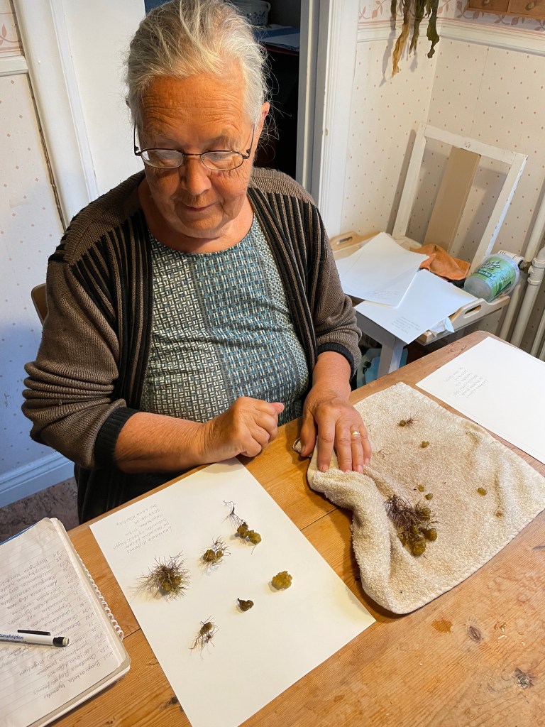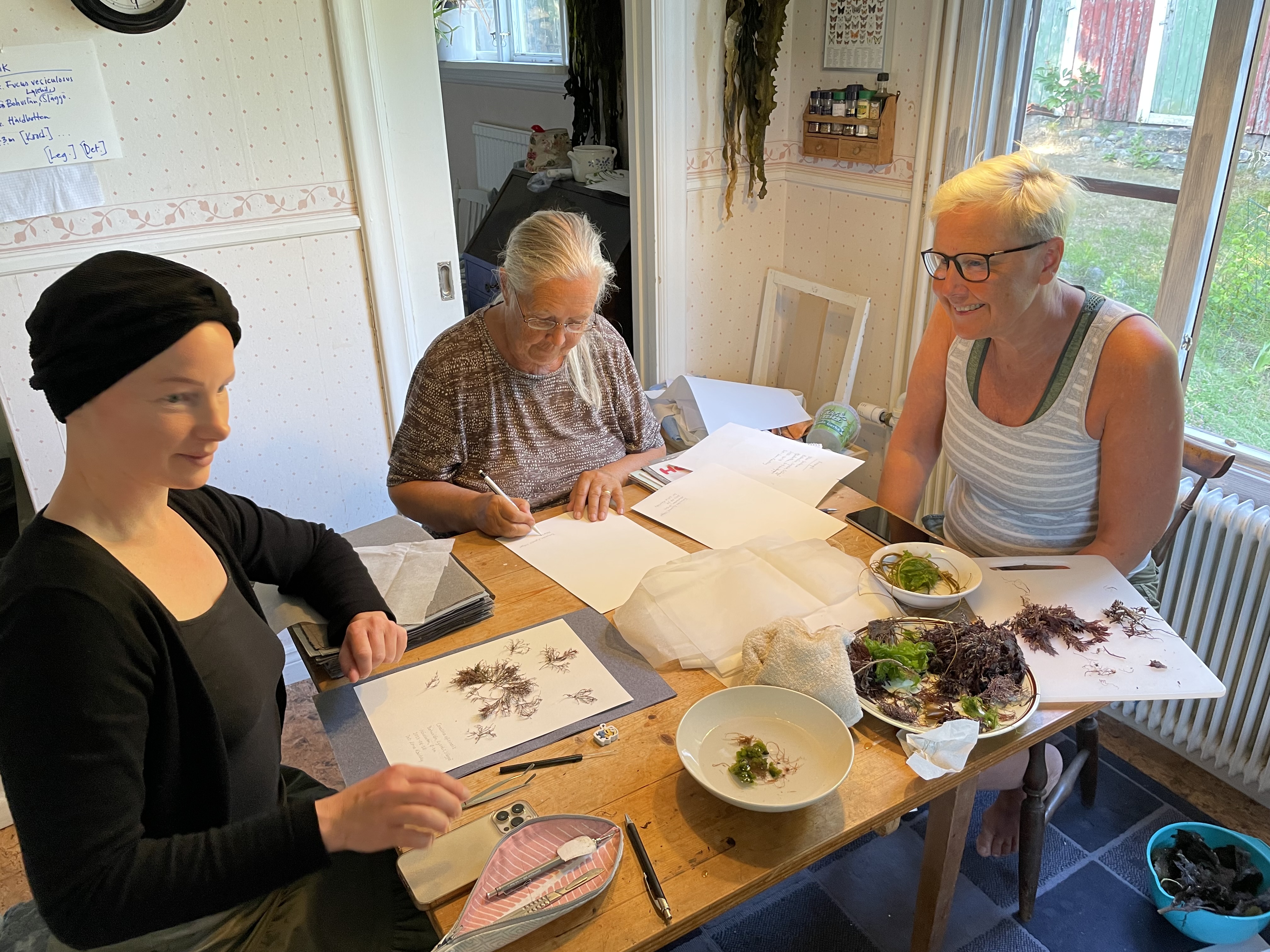 Det lilla köksbordet fylls av alger, papper och skratt när dagens insamlade material ska tas om hand.