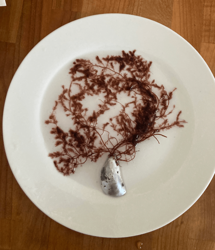 Efter någon timmes insamlande var vi alla rätt nerkylda, det varma vattnet till trots. Det ska ju även till en hel del efterarbete med det insamlade materialet innan dagen är slut, så vi packade ihop och rullade hem. Resten av dagen och kvällen gick åt till att öppna påsar (julafton!), fundera på vad sjutton man hade plockat för något, reda ut allt som trasslat ihop sig, bestämma till art, skriva etikett, montera och lägga mellan gråpapper. Pust! Att arbeta hemma i köket är lite mindre yta än på kurslab, vilket jag är van vid, men det gick fint efter lite justeringar. Många byttor och baljor med alger blev det.