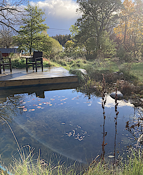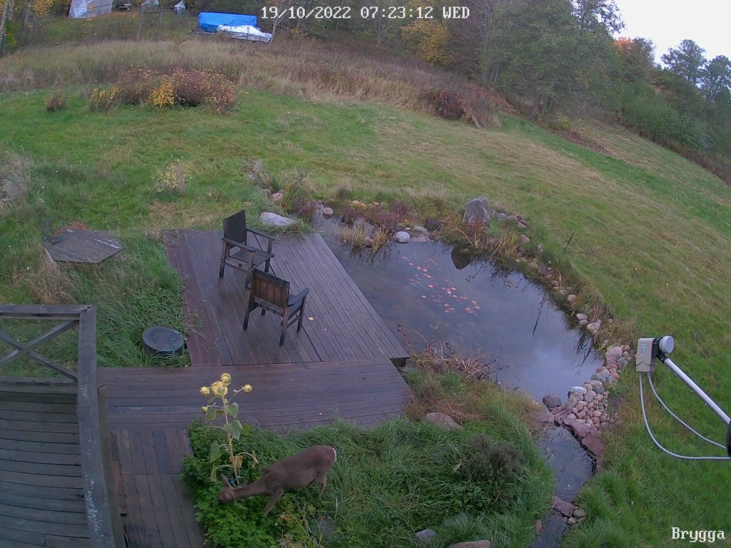Det är inte heller något fel på djurlivet i och omkring dammen. I morse stod ett rådjur och åt flitigt på persiljan. Under sommaren har de ätit upp blomknopparna av malva och vänderot men när de nu har blommat över och mycket är visset smakar den fint gröna bredbladiga persiljan mums. Nu är den skyddad från mer bete av flera nät som täcker det mesta.