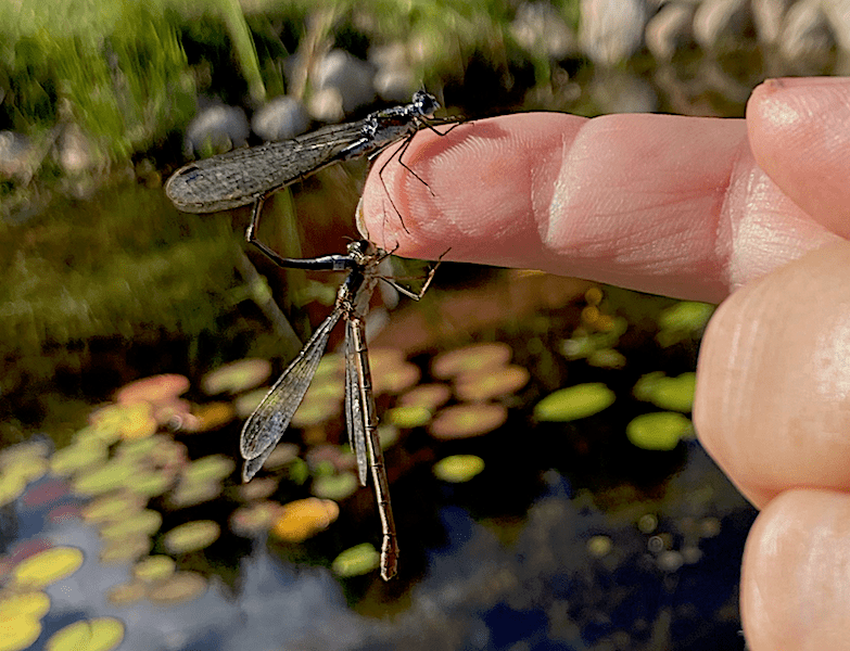 Men det som kändes jättefint var när jag i augusti räddade två sländor som höll på att drunkna när de missade och hamnade i vattnet. Lyckades fånga upp dom med fingret och höll dom där tills vingarna hunnit torka i solen och de kunde flyga vidare. Fortfarande hårt sammankopplade.