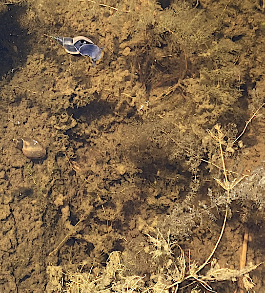 Det finns så mycket att titta på. Varje gång som man stannar till en stund så upptäcker jag något nytt eller ser något som jag inte tänkt på tidigare. Som denna stora dammsnäcka som flyter på ytan, upp och ner. Undrar om den märker när jag böjer mig över ytan så att den skuggas?
