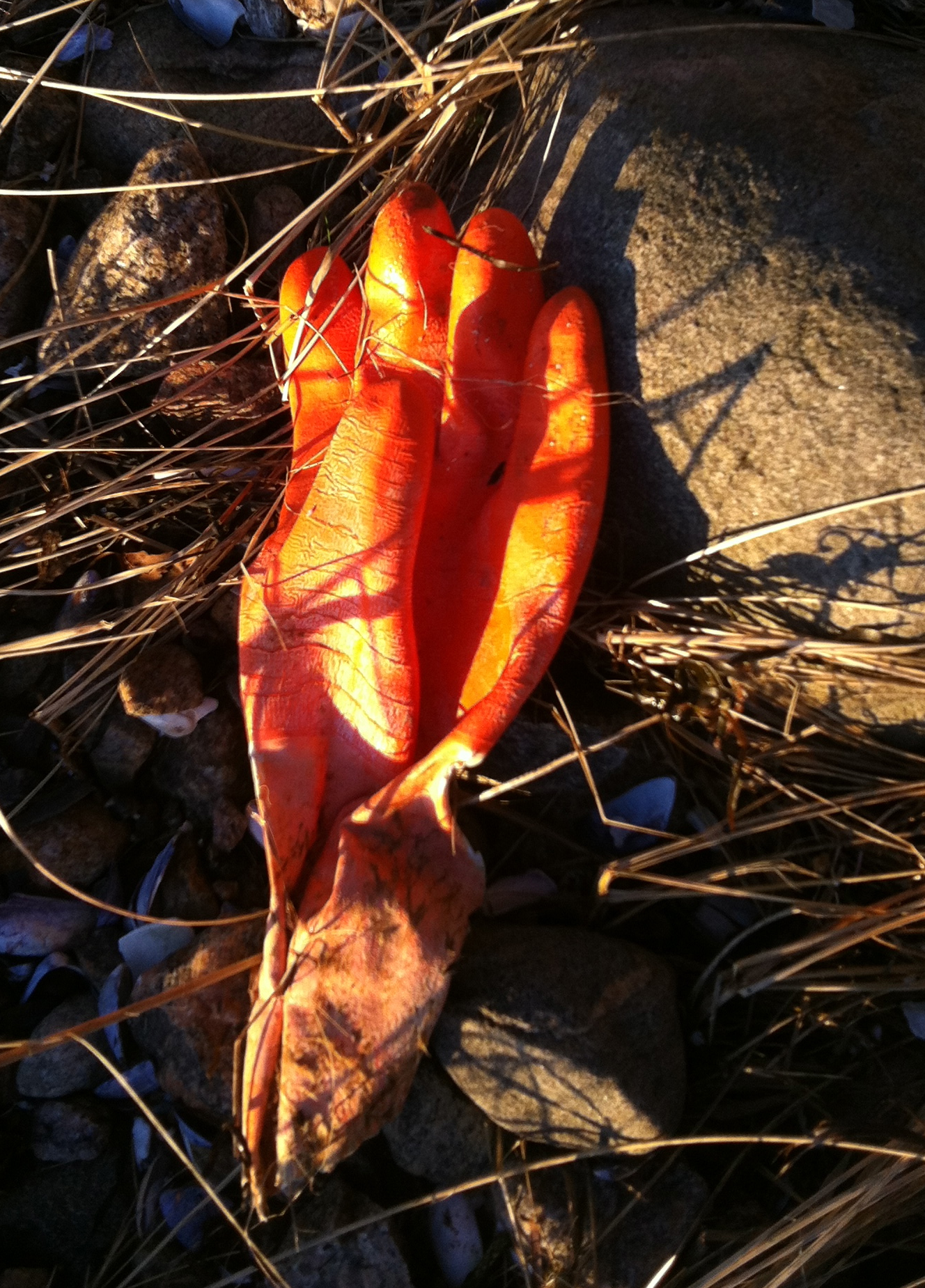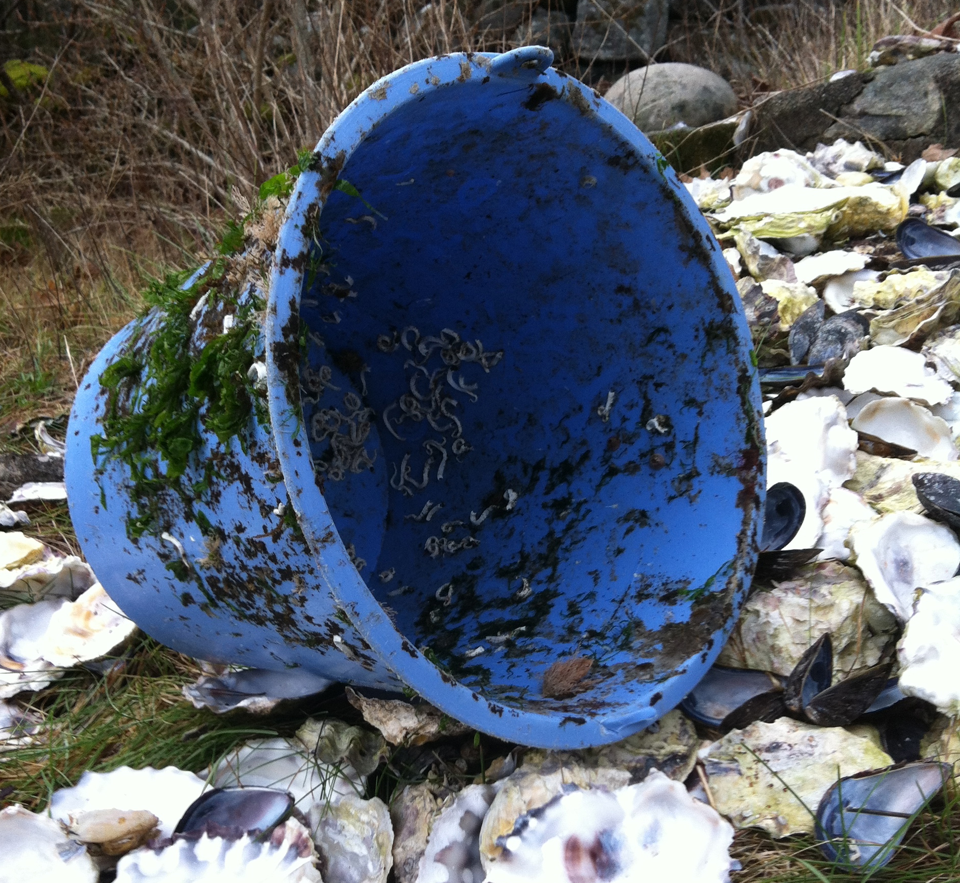 Min andra spaning gäller vad som finns på alla plastbackar som låg uppspolade på stranden. Den röda backen som kommer från Clanawley fiskeri företag på Irland och antagligen spolats överbord när fartyget varit ute till havs var fullsatt med små, vita runda skal av Anomia spp., en mussla som ingår i gruppen sadelostron. På bilden syns de flesta sittande under kanten på backen. De är inte lätta att artbestämma, speciellt inte när de är små och relativt nyligen satt sig fast. Den art vi har i svenska vatten blir ca 5-6 cm stora.