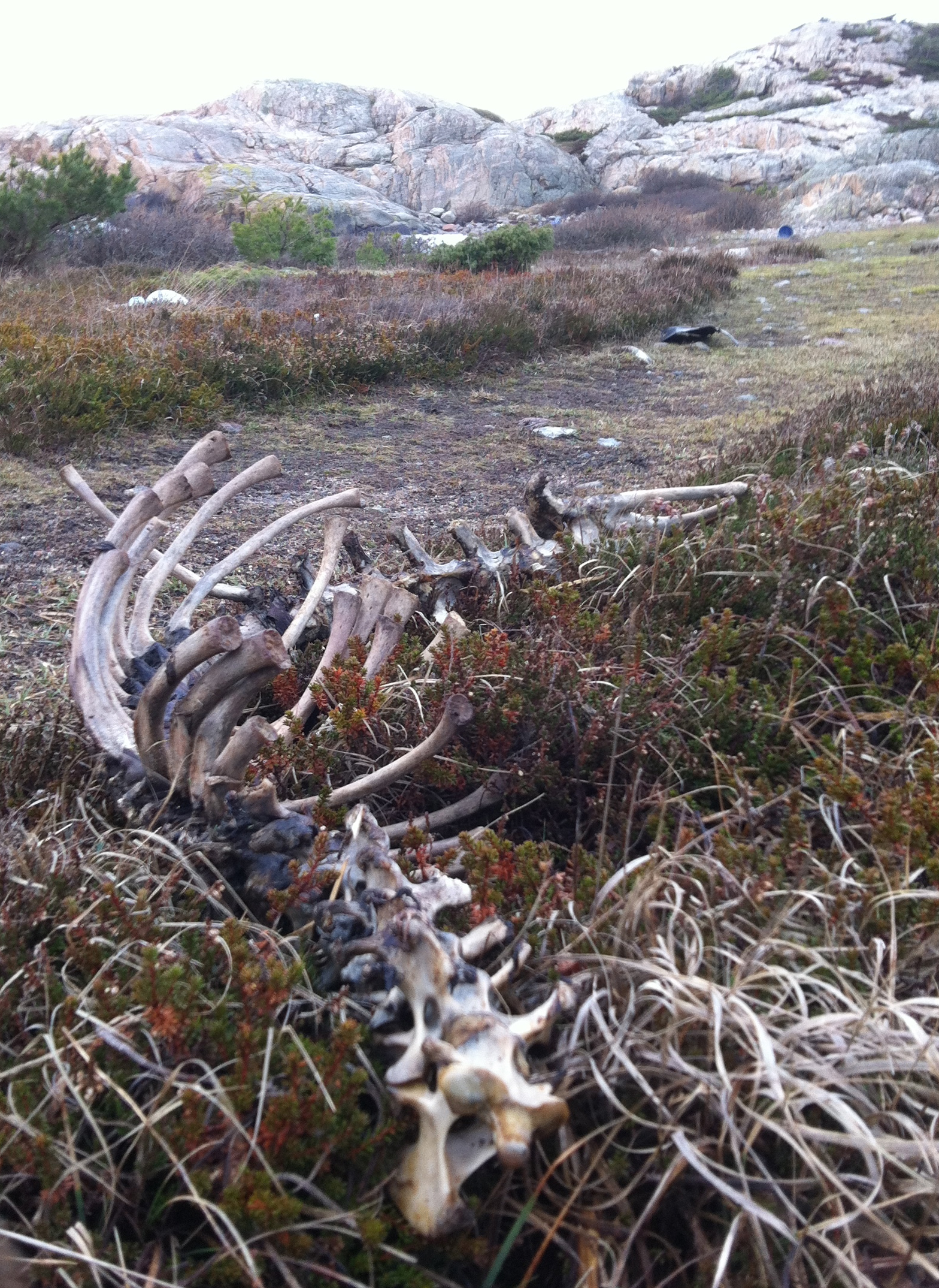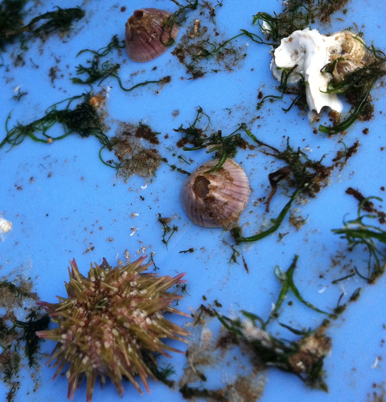 På insidan av backen växer det stora kolonier (tre syns tydligt)av ett mossdjur. De växer platt mot botten från en första individ som fäst sig i mitten och sedan delar sig, och delar sig. När de stöter på en annan koloni börjar de växa uppåt och försöker växa över den andra och konkurrera om plats. Att växa till så stora kolonier tar tid så denna back kan ha drivit runt i havet sen i somras, kanske 5-6 månader.