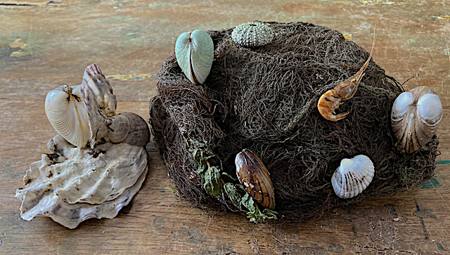 Blekta rödalger tillsammans med skal av blåmussla och ostron.