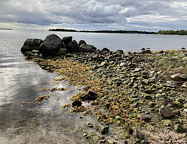 Det har redan drivit iland ganska mycket blåstång och vattenväxter på stränderna. Lite olika artsammansättning beroende på vad som dominerar på botten utanför. Som på dessa två stränder som ligger nära varandra på Riddersholms naturreservat, Rådmansö i norra delen av Stockholms skärgård.