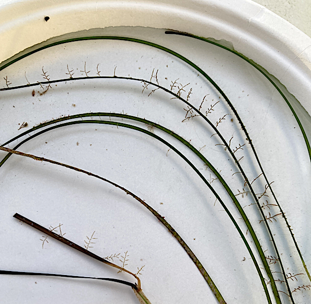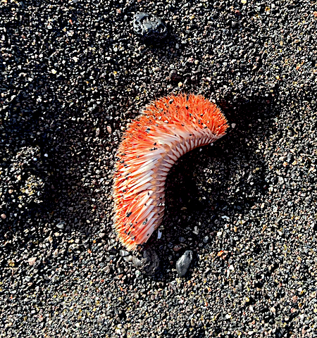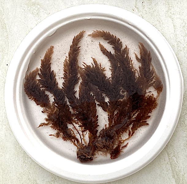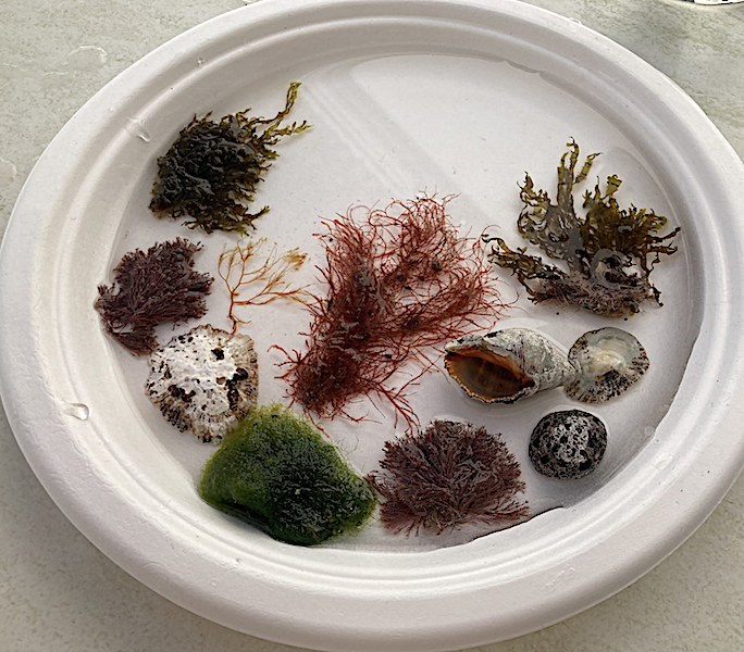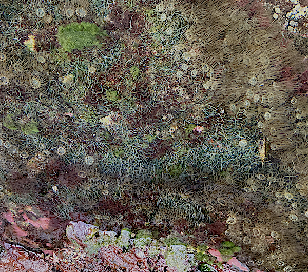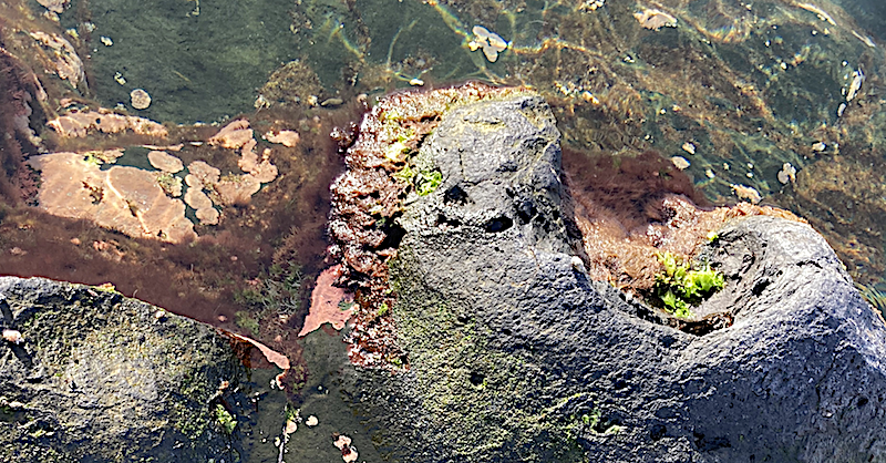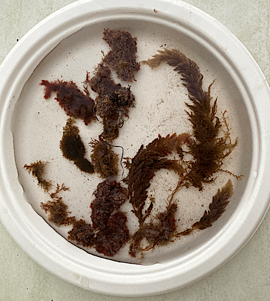 Strax under den spegelblanka ytan låg många fintrådiga rödalger lösa på botten. Där klarar de att leva även om vattnet är kallt. Det de inte tål är att hamna uppe på land och täckas av frostkristaller. Då sprängs cellerna. Men tänk så vackra mönster en frostig rödalg bildar tillsammans med tången på stranden.