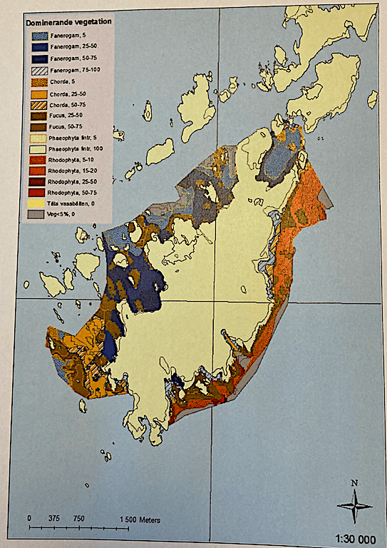 Det syns tydliga skillnader mellan de olika sidorna av ön. På den västra delen av ön finns det tät vegetation av olika samhällen av vattenväxter (markerat i blått, ju mörkare färg dessto tätare bestånd), tillsammans med Fucus vesiculosus, blåstång (i mörkbrunt) där det är mer klippbottnar. På lite blandade bottnar med stenar och mjukt sediment är ängar av Chorda filum , sudare vanliga markerat i gulbrunt.